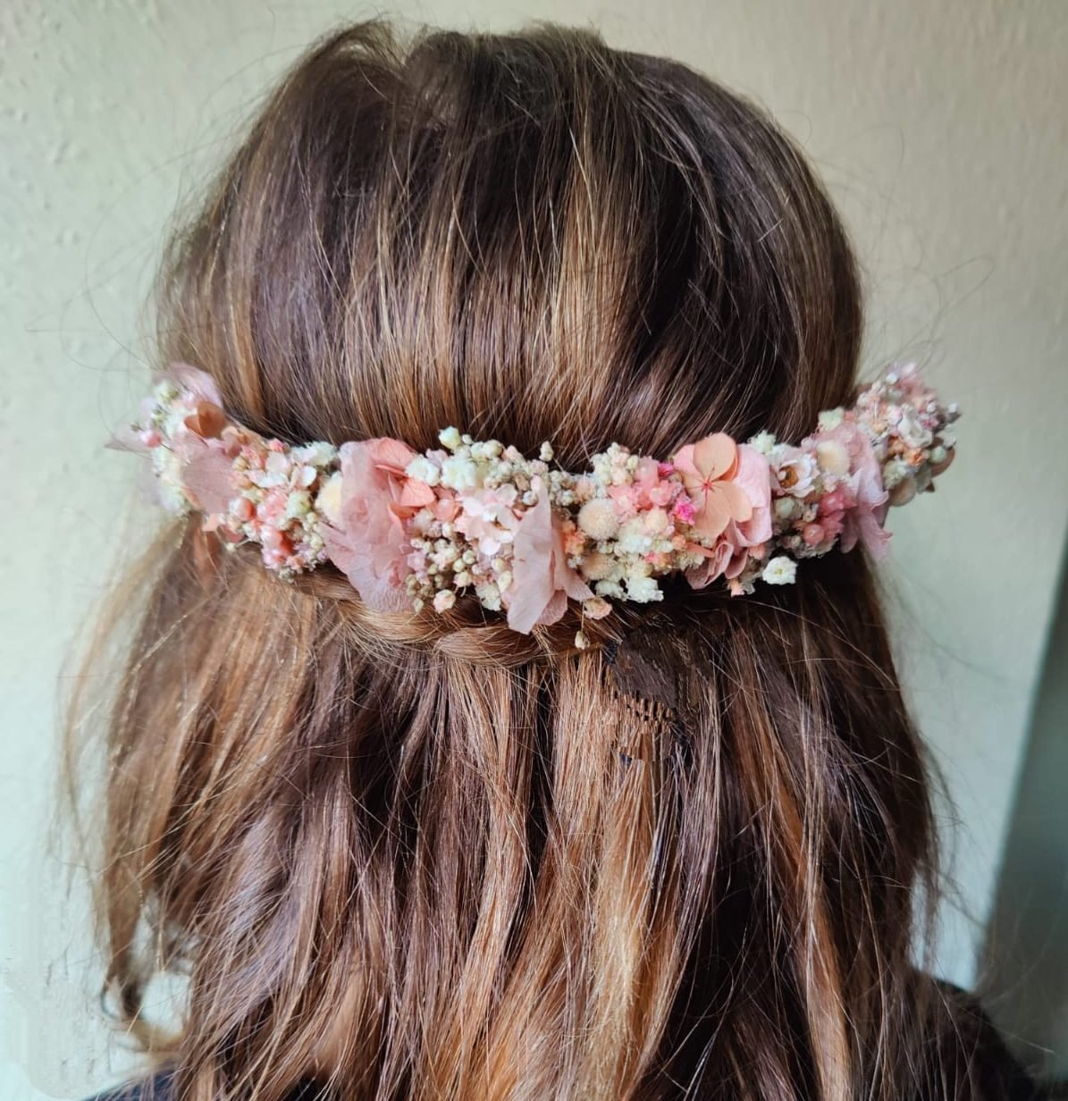 Confeccionada con paniculata y hortensia tonos rosas empolvado con flor 100% preservada.