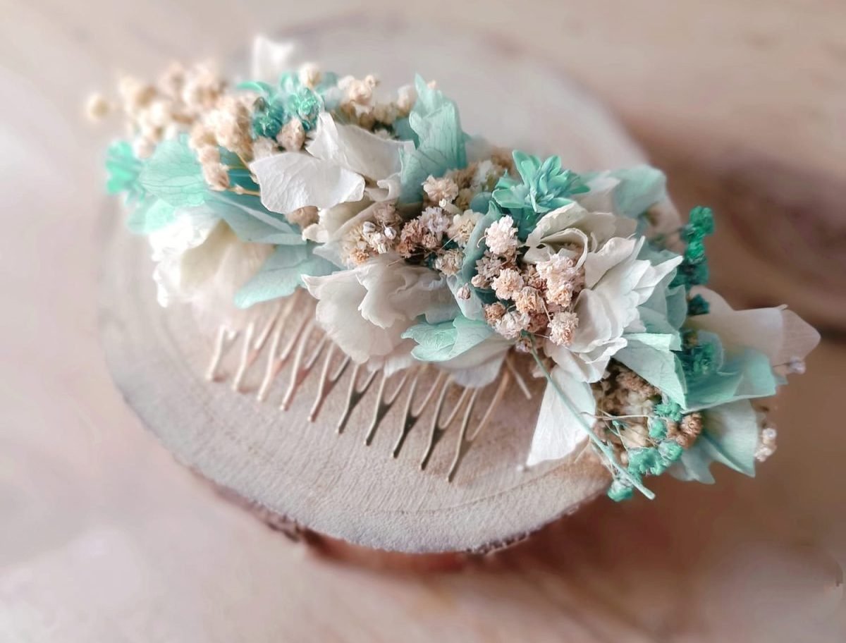 Flor preservada. No marchita. Tamaño 13 cm. En la parte de atrás lleva dos arandelas para pasar unas horquillas y terminar de ajustar al peinado.